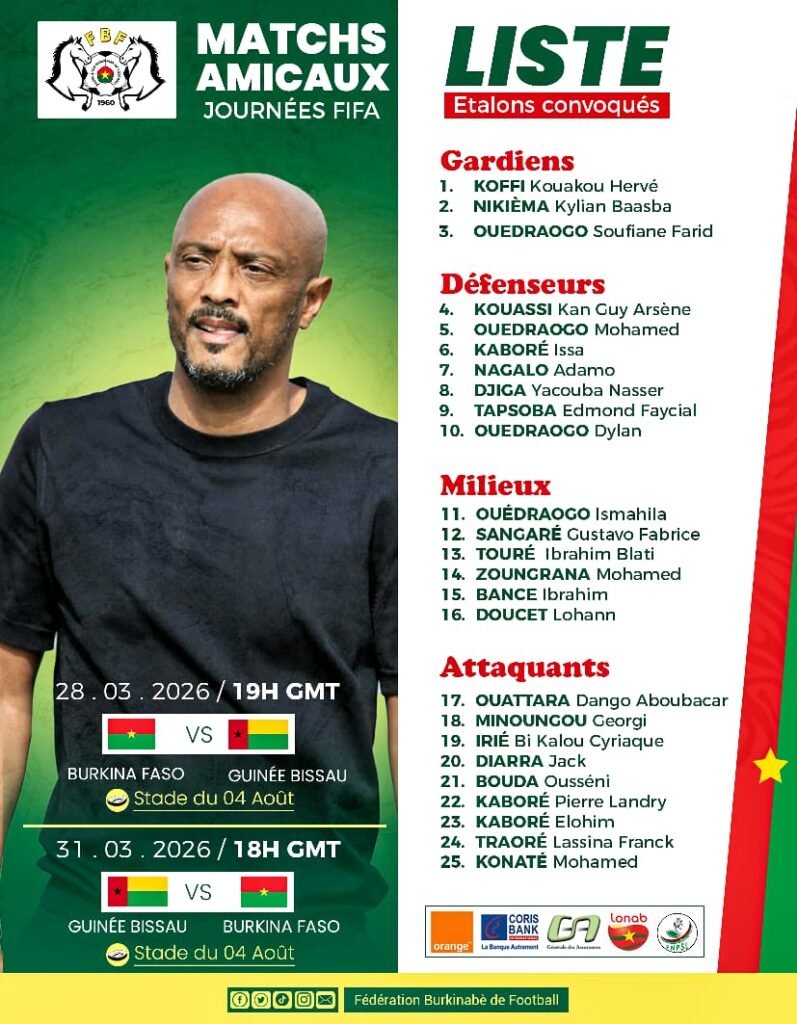 Ă€ peine installĂ© sur le banc de l’Ă©quipe nationale du Burkina Faso, le nouveau sĂ©lectionneur Amir Abdou a dĂ©voilĂ© sa toute première liste de joueurs convoquĂ©s. Pour les confrontations amicales contre la GuinĂ©e-Bissau prĂ©vues les 28 et 31 mars 2026 au Stade du 04 AoĂ»t, le technicien franco-comorien a envoyĂ© un signal fort : rigueur, continuitĂ© et ouverture.