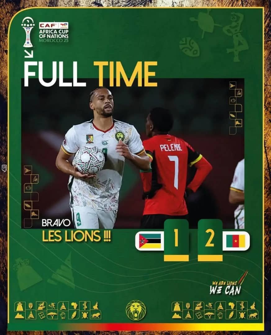 Ce mercredi 31 décembre 2025, au Grand Stade d’Agadir, les Lions Indomptables du Cameroun ont offert une performance pleine d’envie, de caractère et d’efficacité contre le Mozambique dans l’ultime match du groupe F de la Coupe d’Afrique des Nations TotalEnergies 2025. 🇨🇲🔥